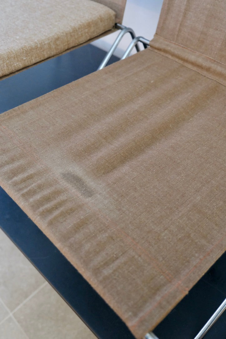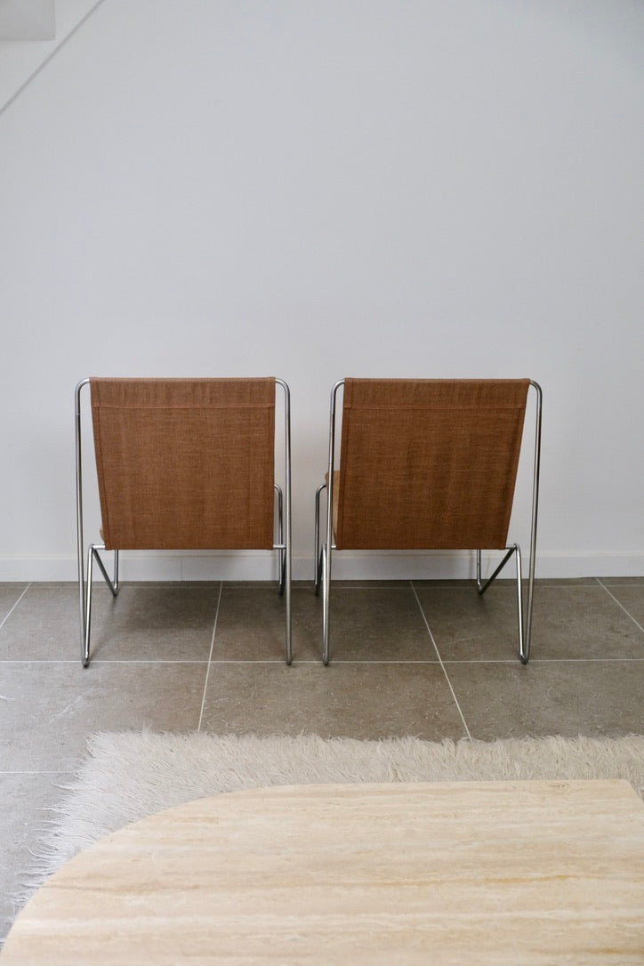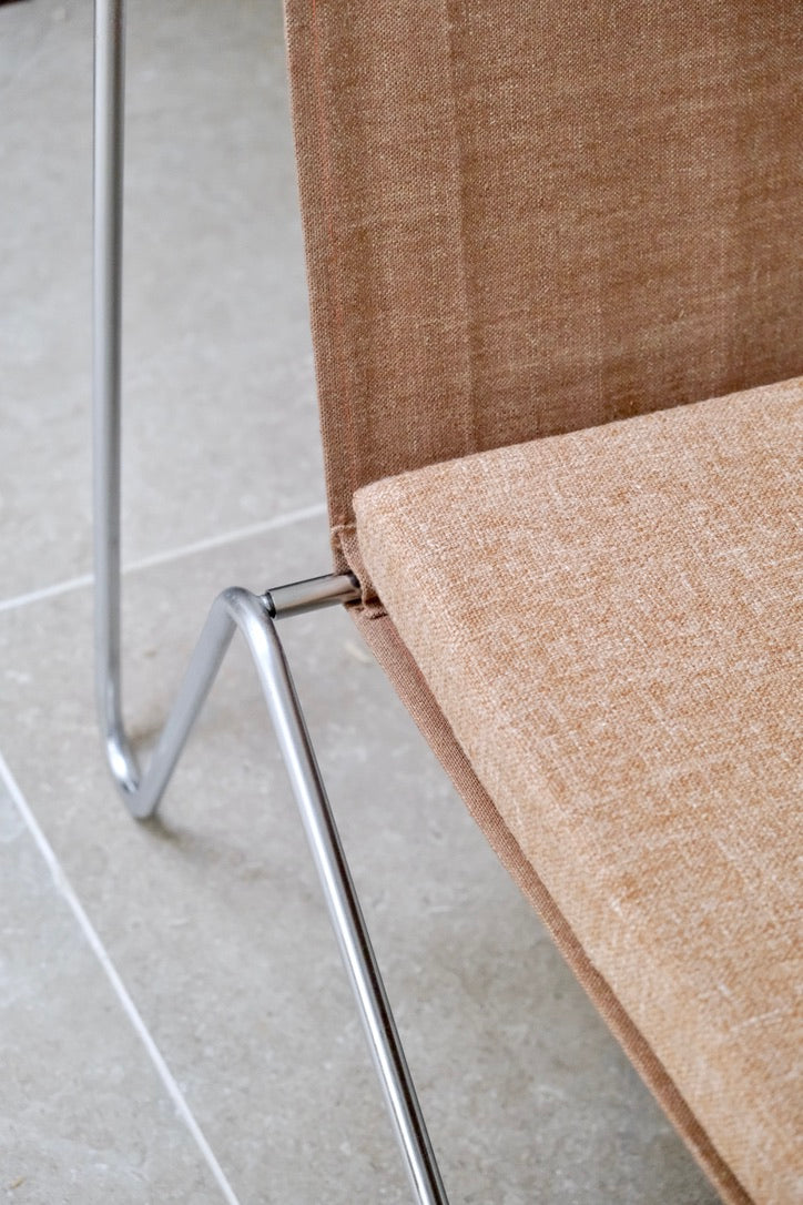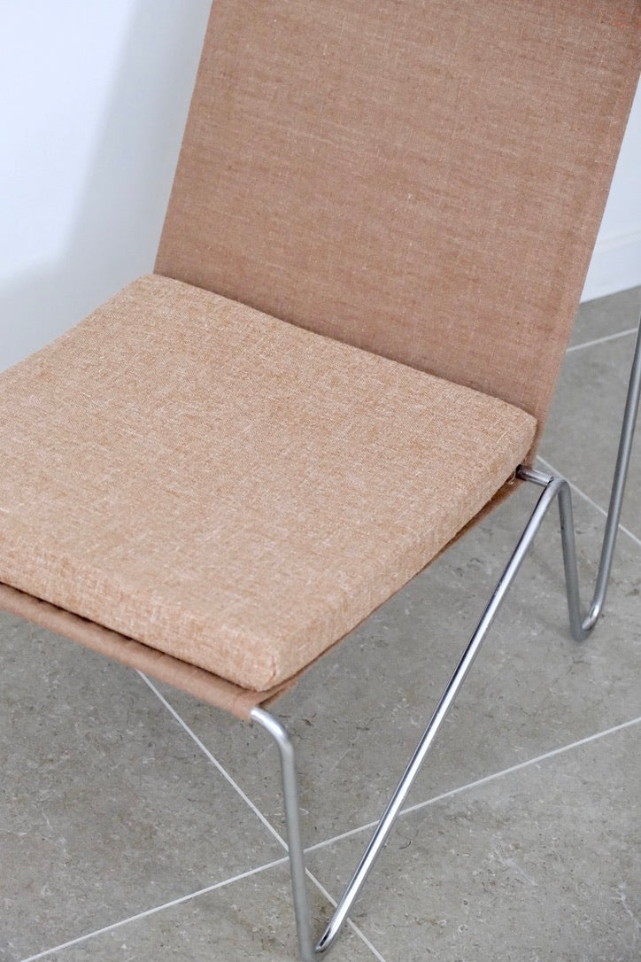 Paire de chauffeuses modèle 3335 "Bachelor"*, par Verner Panton (1926-1998) pour Fritz Hansen. Structure en acier nickelé filaire. Nouvelle garniture en toile ocre pâle et nouveaux coussins d'assise en lin de même couleur.Danemark, années 1950.