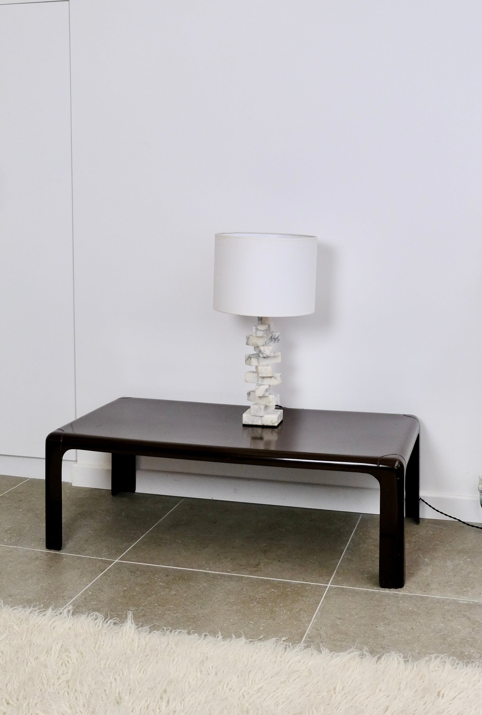 Table basse en fibre de verre et résine conçue par Marc Berthier *(1935-2022) pour Roche Bobois en 1967. Modèle de la collection Ozoo, reonnaissable par les angles particuliers. Revêtue d'une laque marron chocolat, qui porte quelques traces du temps, mais un bel état d'ensemble. Une pièce intemporelle et minimaliste.