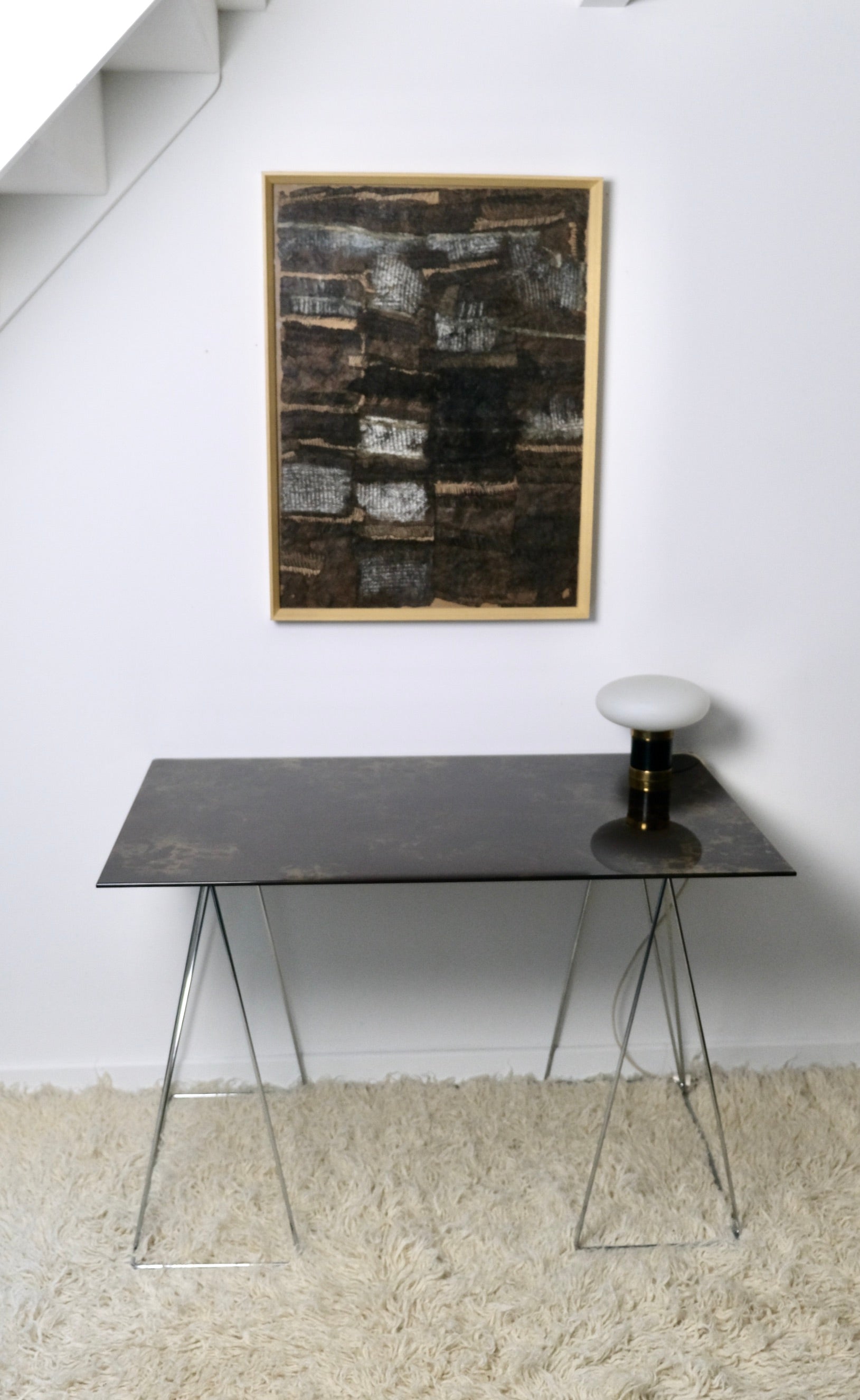 Table-bureau en verre fumé et tréteaux Max Sauze